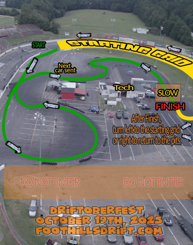Park in the designated Driver Parking area. Tech inspection begins at the Tech Shed, which is located at the center of the track. To keep things running smoothly, we ask that all drivers be in place and ready before the track goes hot at 11:00am.
